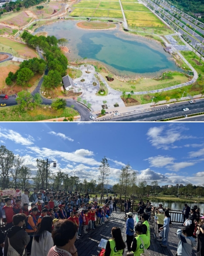 龍州濕地是九龍江流域山水林田湖草沙一體化保護和修復(fù)項目海綿城市建設(shè)范例工程,也是我市2023年十大重點攻堅項目北部新城建設(shè)的“點睛之筆”,主要使用的是國家政策補助資金。項目占地面積約20公頃,通過“護山、理水、營林、興田、清湖、豐草”六大舉措,構(gòu)建了蓄洪湖區(qū)、生態(tài)修復(fù)區(qū)、農(nóng)田區(qū)及休閑區(qū)多樣用地,同時,設(shè)置了蓄洪湖、濕地步道、山谷攔蓄、引水工程等海綿設(shè)施,實現(xiàn)“城在田中田在城中”山水田園與城市和諧共生的美好景象。