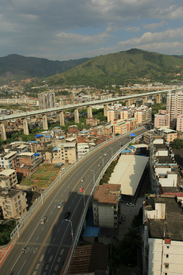 龍巖市東興高架橋位于龍巖市中心城區(qū)東北部,總投資9926萬元, 城市主干道Ⅱ級,為東興路東風橋至南環(huán)路段,該路段長約740米,屬城市內(nèi)環(huán)線,車流量大,沿線與登高東路、鐵路、棋盤路及南環(huán)路相交,與鐵路平交處該路段高架橋上跨鐵路;在登高東路與東興路高架橋之間設(shè)置A、B、C、D匝道(均為單向單車道)利用4條匝道將既有登高東路與東興路相連,從而在東興路與登高路之間形成半苜蓿葉型互通式立交。高架橋全長461.77米,沿線與登高東路、漳龍鐵路、棋盤路及支小路相交,本工程采用高架上跨形式,跨越相交道路與鐵路,完全解決了與鐵路平交的安全隱患。橋梁上部結(jié)構(gòu)采用(18.5+20+20)m普通鋼筋砼連續(xù)梁及25m、30m預(yù)應(yīng)力砼空心板梁,橋面連續(xù),下部采用樁接立柱接蓋梁橋墩與U型橋臺,墩臺基礎(chǔ)采用鉆孔灌注樁基礎(chǔ)。