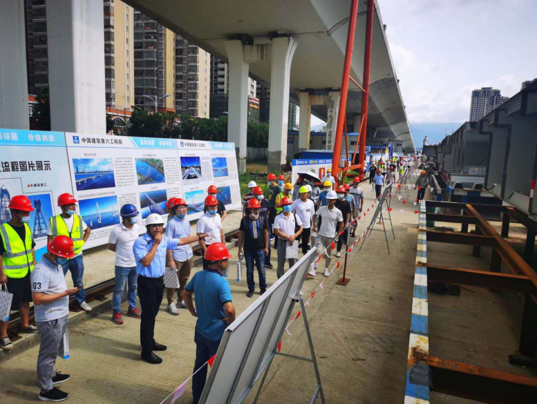 2020年6月28日,由龍巖城市發(fā)展集團(tuán)有限公司主辦,龍巖市政建設(shè)集團(tuán)有限公司(市城投公司)承辦,北京鐵研建設(shè)監(jiān)理有限公司、中國(guó)建筑第六工程局有限公司、中冶(上海)鋼結(jié)構(gòu)科技有限公司協(xié)辦的龍巖大道高架橋項(xiàng)目質(zhì)量安全標(biāo)準(zhǔn)化觀摩會(huì)在龍巖大道高架橋主橋鋼箱梁工程現(xiàn)場(chǎng)舉行。觀摩會(huì)分拼裝區(qū)域、提升站區(qū)域、頂推滑移區(qū)域、步履滑移區(qū)域及主橋轉(zhuǎn)體區(qū)域分別展示了龍巖大橋主橋鋼結(jié)構(gòu)拼裝、提升、弧形頂推滑移、步履滑移等新工藝及主塔“水平二次轉(zhuǎn)體”鋼箱梁頂推、斜拉索施工技術(shù)。